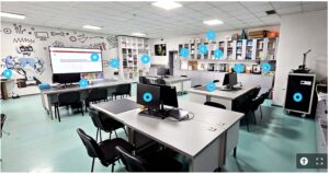 This image showcases a state-of-the-art digital school classroom, specifically designed to support STEAM (Science, Technology, Engineering, Arts, and Mathematics) education and hands-on learning with advanced technology.